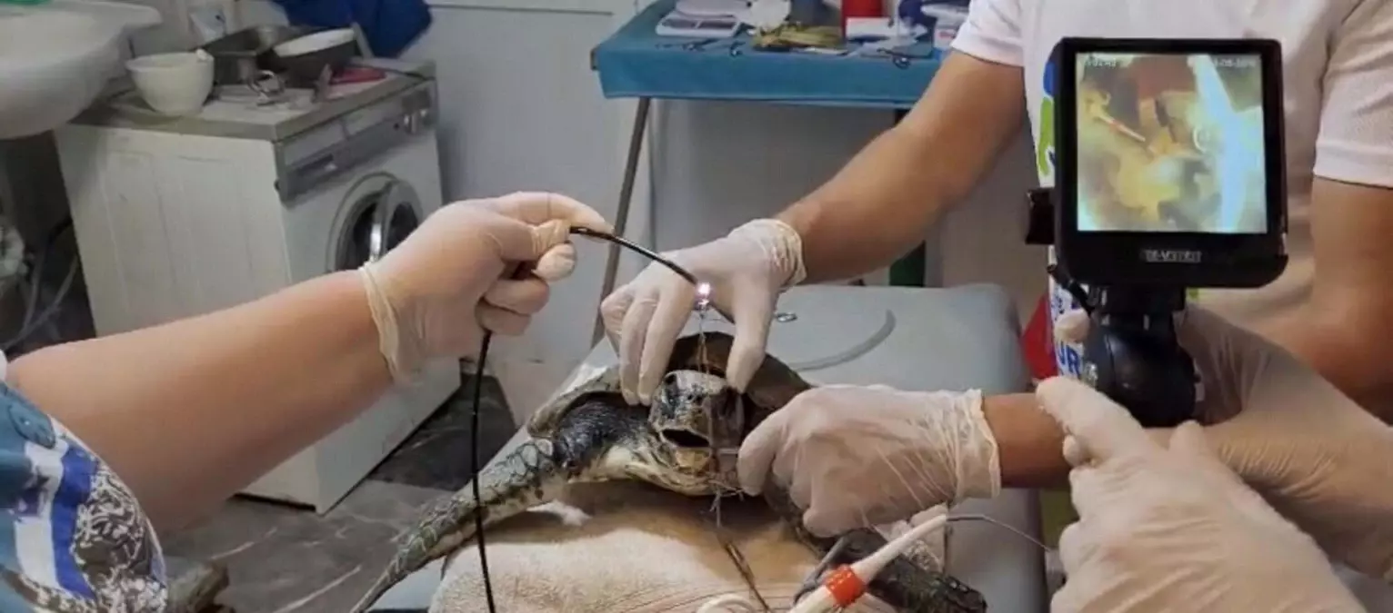 Akyaka açıklarında hareketsiz caretta carettayı görenler, durumu DEKAMER’e bildirdi. Yaralı olduğu için hareket edemediği belirlenen deniz kaplumbağası, bölgeye gelen gruplar tarafından kıyıya çıkartılıp, DEKAMER’e götürüldü. Merkezde tüm beden röntgeni çekilerek ayrıntılı bir kıymetlendirme yapılan carettanın sağ ön yüzgeci ile ağzında misina tespit edildi.