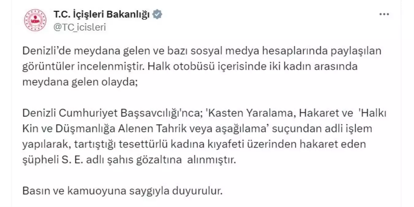 İçişleri Bakanlığı, Denizli‘de iki yolcunun arbede ettiği olaya ait toplumsal medya hesabından açıklama yaptı. Açıklamada, ” Denizli‘de meydana gelen ve kimi toplumsal medya hesaplarında paylaşılan imajlar incelenmiştir. Halk otobüsü içerisinde iki bayan ortasında meydana gelen olayda; Denizli Cumhuriyet Başsavcılığı’nca; ‘Kasten yaralama, hakaret ve halkı kin ve düşmanlığa alenen tahrik yahut aşağılama’ cürmünden isimli süreç yapılarak, tartıştığı tesettürlü bayana kıyafeti üzerinden hakaret eden kuşkulu S.E.adlı şahıs gözaltına alınmıştır” denildi.